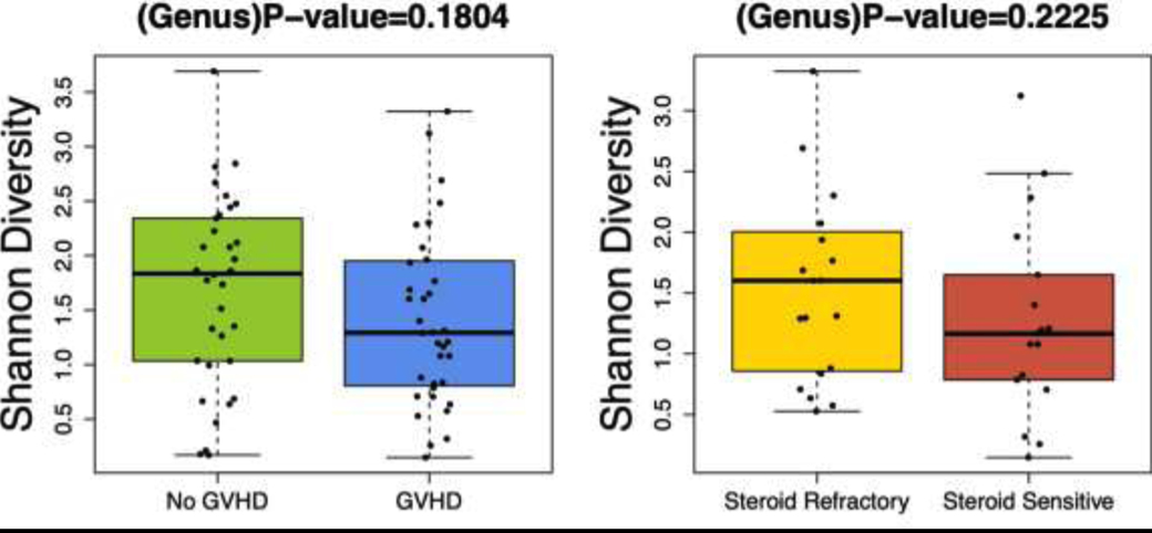 Acute steroid-refractory GI GVHD is not associated with significant differences in gut taxonomic composition compared to steroid-sensitive GI GVHD immediately prior to onset of disease: GI GVHD is not characterized by gut microbial differences preceding symptom onset.